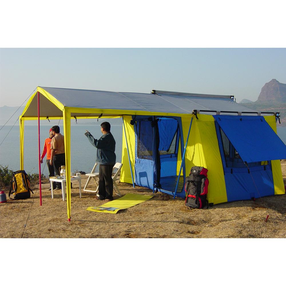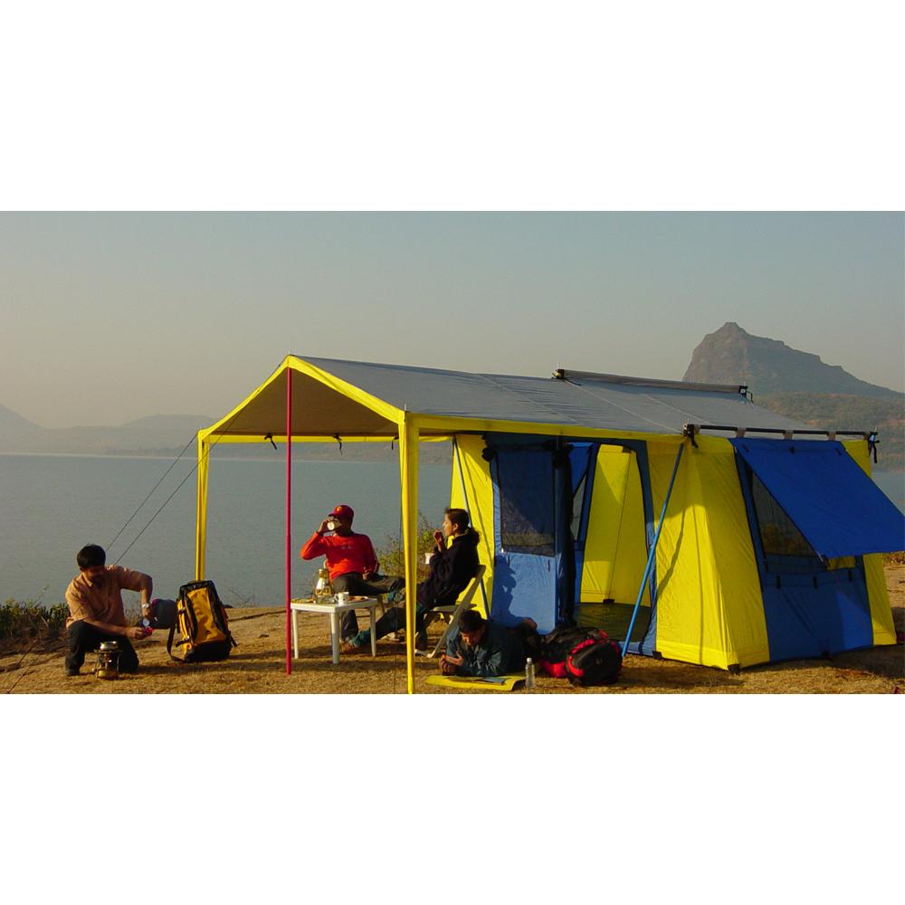 Multiple windows maintain excellent ventilation within the tent. An aesthetic awning works as additional sit out area.