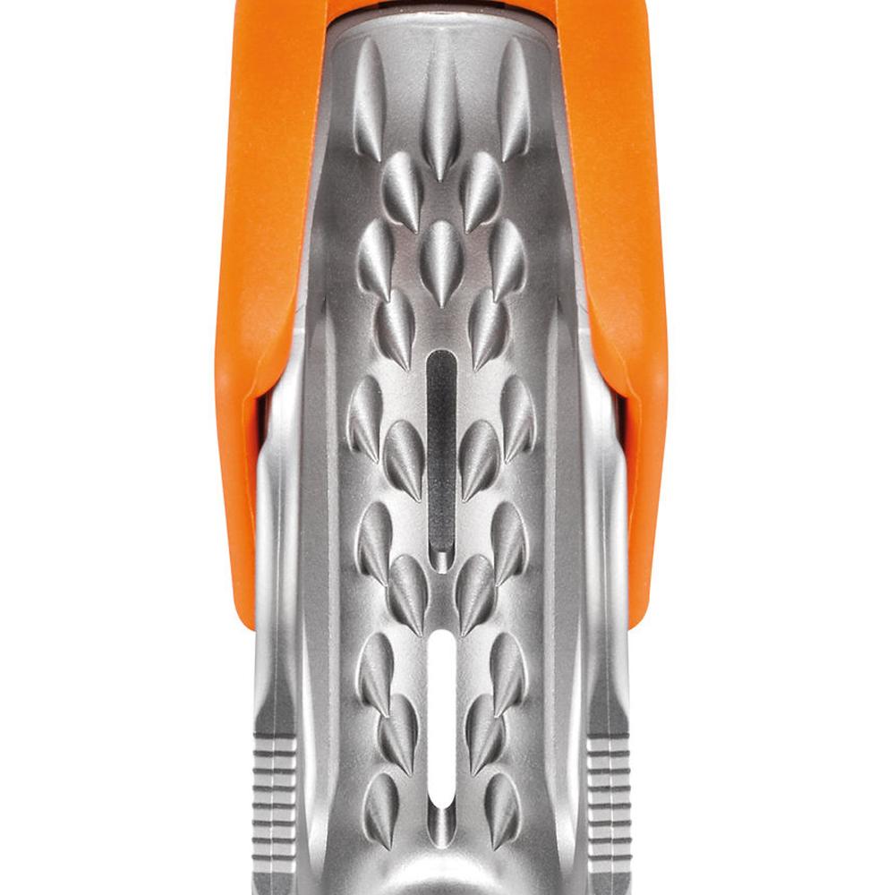 - Stainless steel cam with angled teeth and evacuation slot securely grips the rope, even in muddy or icy conditions